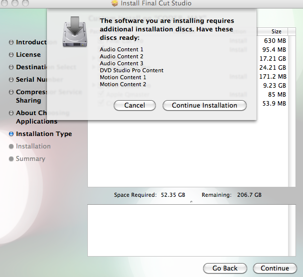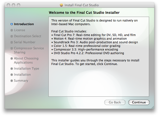 * 4GB of disk space required to install all applications (Final Cut Pro, Color, DVD Studio Pro, Soundtrack Pro, Motion, Cinema Tools, Compressor, and Apple Qmaster)